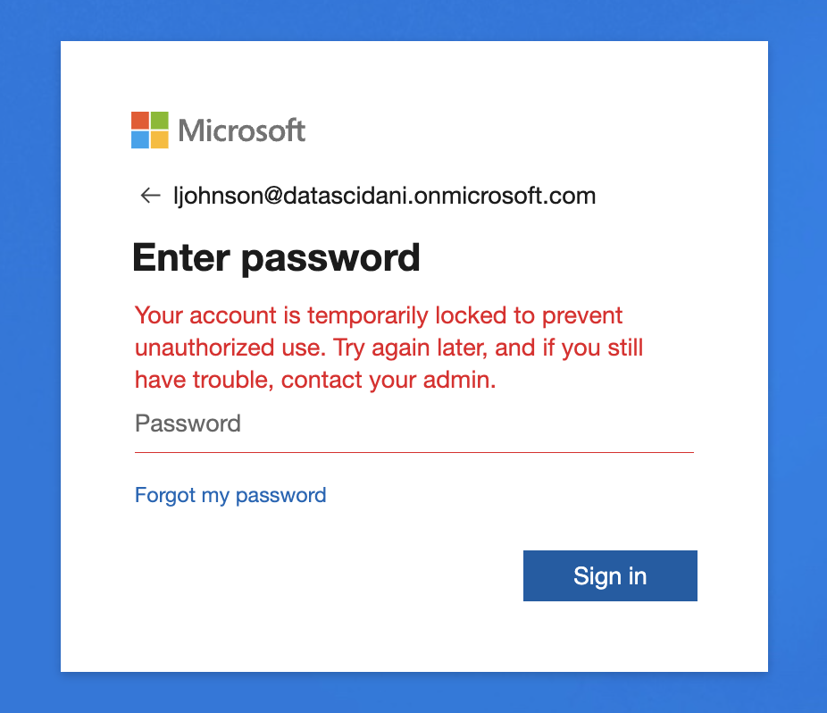 I tested this out on one of my users, Laura Johnson. She made five attempts to log in to her account but as you can see she was unsuccessful. Her account was locked for thirty seconds.