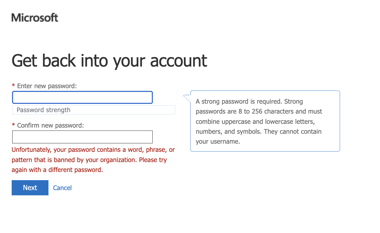 She then tried to reset her password using “DataSci” and “NewYork” as part of her password. Both times, it gave her the following message. This means that the custom banned list created earlier was enforced and she cannot create passwords using the words on that list.